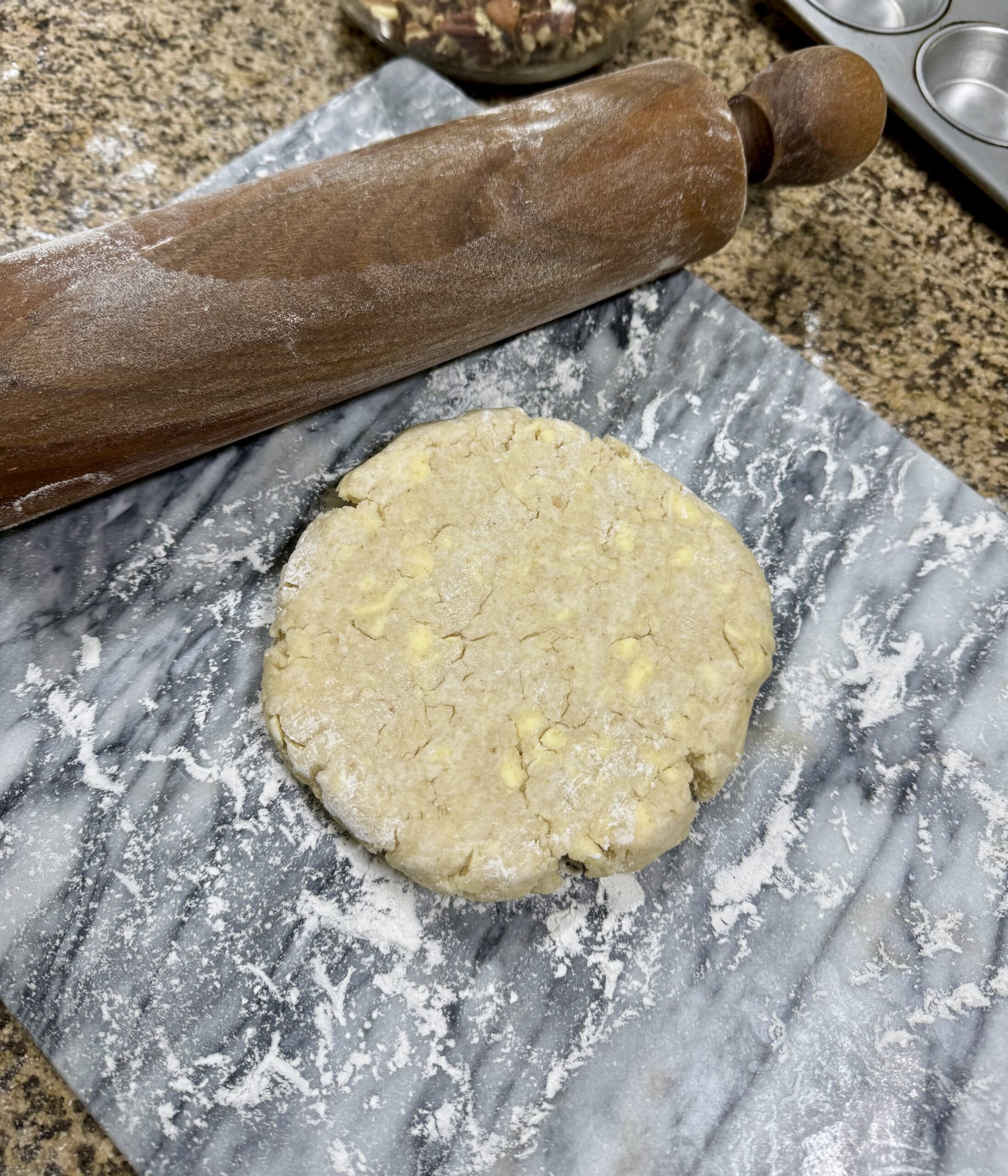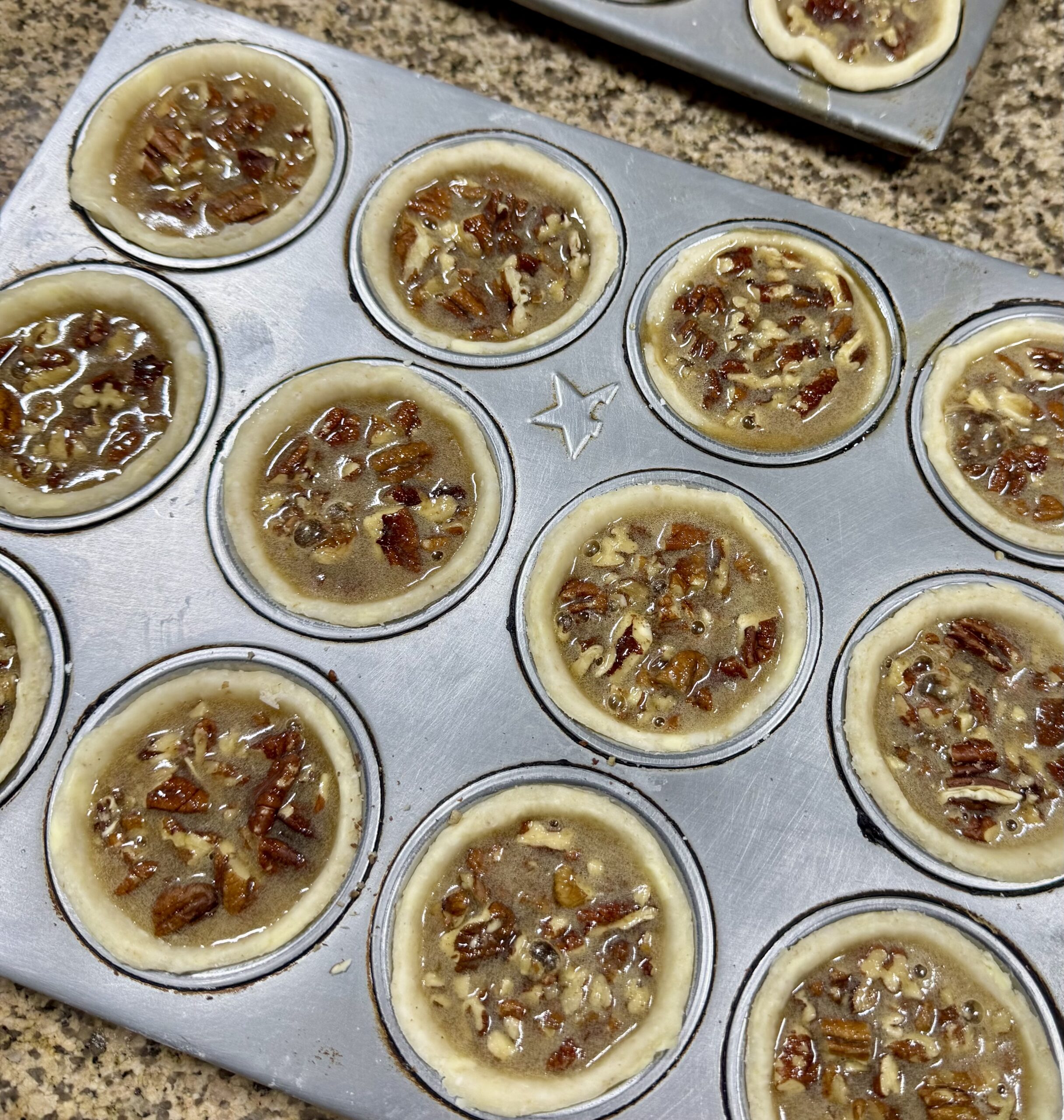 Press the dough circles into the muffin or tartlet tin, gently forming them to the bottom and sides. Now you’ll want to chill it again while you chop up the pecans and mix the filling. Note: keep the pecans separate from the filling, because you’re going to put them in the bottom of the tart shells first, before carefully pouring in the filling mixture. If you mix the pecans into the filling mixture, you’ll have a really hard time pouring the right amount into each shell while still getting a decent amount of pecans in there too, and not overflowing the whole thing. Trust me on this one.