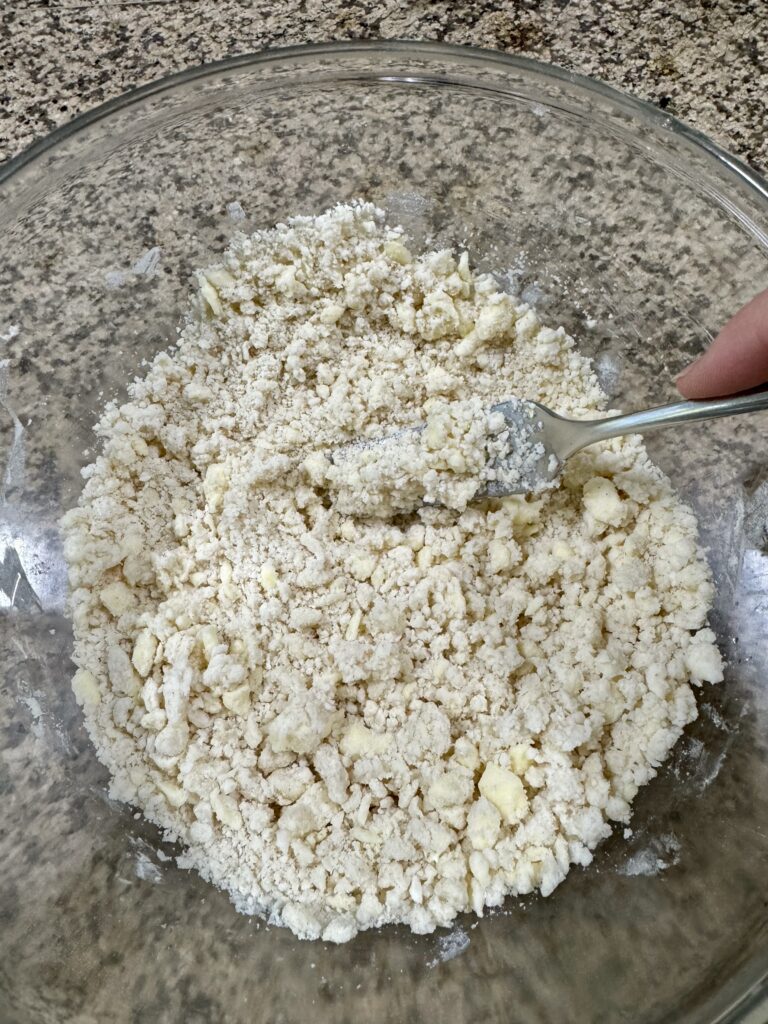 Add the water 1 tablespoon at a time, and stir the flour mixture with a fork as you’re adding, to distribute the water as evenly as possible over the dry ingredients. In the humidity of Manila, I only need 3- 3 1/2 tablespoons, but when I’m in Steamboat, I need four, due to the dryness of the air. So just watch your dough, and when it looks like the crumbs are beginning to stick together, it’s done. Don’t add any more water, as tempting as it may be, or your crust may be tough. Gather the dough into a ball while still in the mixing bowl, using the sides of the bowl to help it press together. Then press it into a flat disk and transfer it to a sheet of cling wrap. Wrap it up and chill it for about 20 minutes while you gather the filling ingredients.