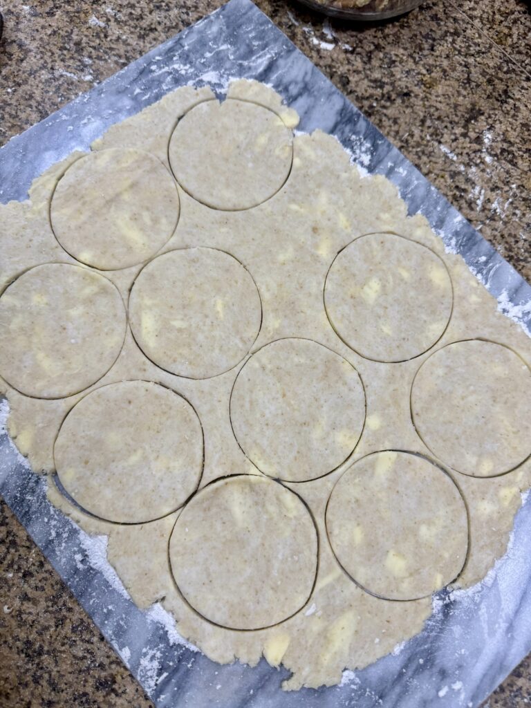 The chilling time not only re-solidifies any melting of the butter and shortening, but also gives the dough a chance to rest and relax, making your baked crust more tender and flaky. When the dough has rested and chilled, roll it out on a floured board. I use a chilled marble block in Manila, but in Steamboat the counters are usually plenty cold already. Roll it evenly to about 1/4-inch thickness, and cut as many rounds as you can in each roll. You want to roll it as few times as possible, because each re-roll will be a bit tougher than the one before. I think I did 3 rolls to cut 16 dough circles.
