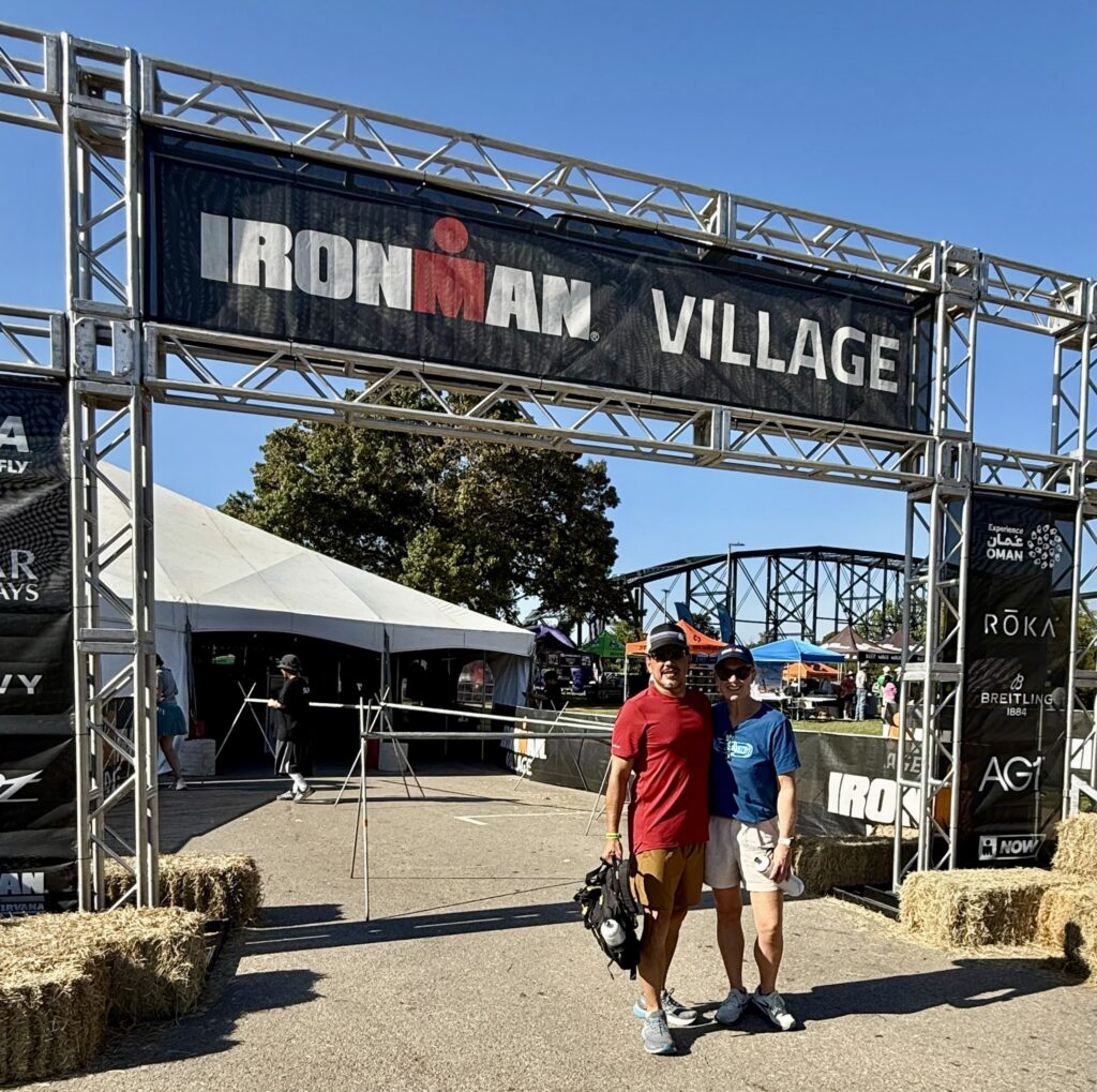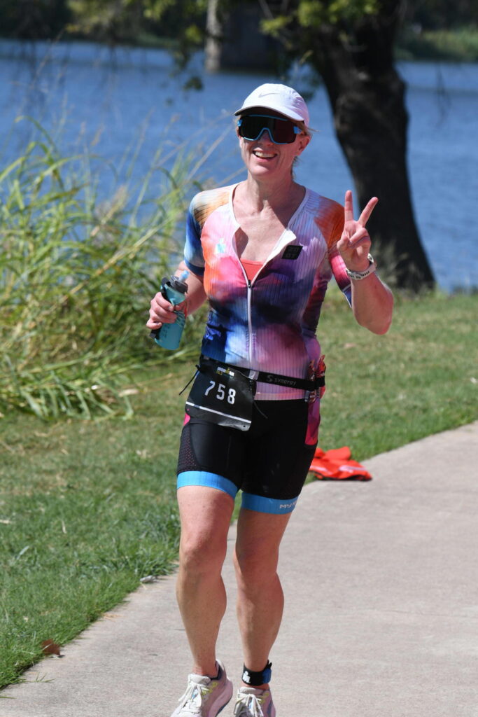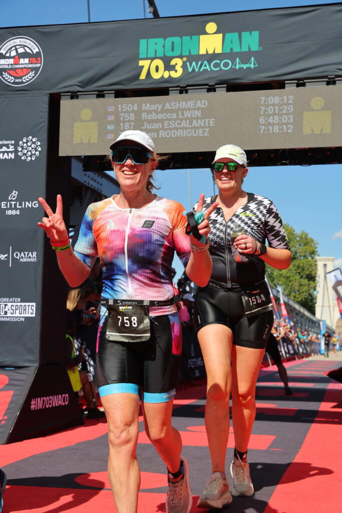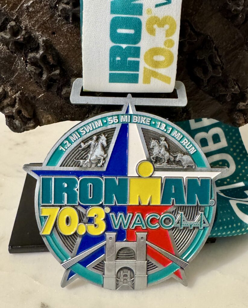 Mark and I have been training for this event since February of this year. It’s our second 70.3 triathlon, and second time to do this particular race in Waco. The distances for a “70.3” are: 1.2 mile swim, 56 mile bike, and 13.1 mile run. Add up these numbers and what do you get? … Yup! 70.3. When we decided to train for the first one in 2024, these distances seemed daunting, and I guess they still do in a way. But the training plan progressed us from an “average fitness level” starting point, to being fairly confident that we could do the whole event in about 7 hours on race day. At the beginning, we were able to swim about a mile (1600m) with rests, bike 1 1/2 hours at an easy pace, and run about 30 minutes- not all on the same day. Week by week, our distances, speed, long workouts, combined workouts (bike + run in the same workout) and overall training volume increased slowly but steadily, until by mid-summer, we were able to bike for 3 1/2 hours (about 95k) followed by a 30 minute run on Saturdays, and then run for 2 hours (about 17k) on Sundays. Weekday workouts were shorter (about an hour) and designed to improve speed and technique. Our overall weekly workout time started at about 5-6 hours a week, and built up to 11-12 hours a week at the height of training. Then about a month before the race, we reduced our training volume back down to 6-8 hours a week, in order to keep the fitness we’d built, but shed the fatigue so we could come into race day feeling fit and ready.