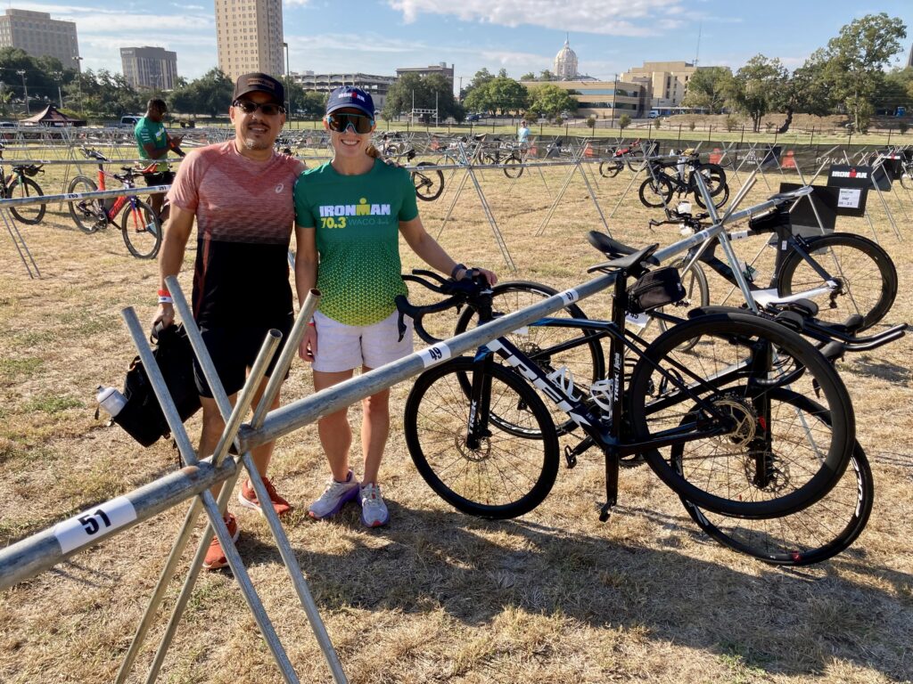 Mark and I arrived in Texas four days before the race. After spending a few days with family in Austin, we headed up to Waco on Friday before the race on Sunday. I wasn’t feeling well on Wednesday and Thursday… dodgy stomach, really fatigued, and slight headache. I was hoping it was due to traveling 32 hours through 13 time zones, but I felt like it was more than that. I spent a lot of time sleeping those first couple of days, and thankfully by Friday I was feeling better. Not great, but definitely better, and able to do a short ride on the race course. Saturday was a busy day with a short practice swim, buying merch in the athlete’s village, attending the athlete’s brief, checking our bikes into the transition area, and of course CARB LOADING!