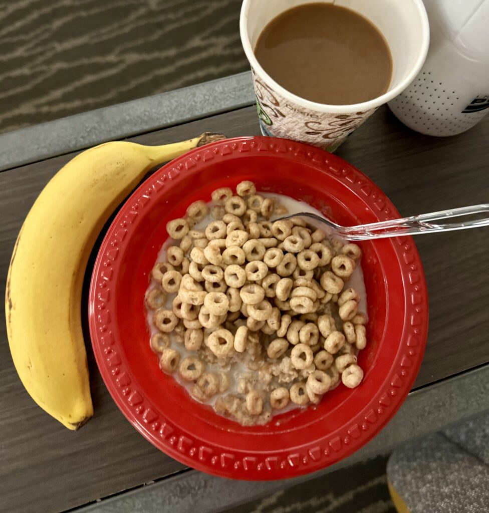 Sunday morning came early, but fortunately Mark and I were still a bit jet-lagged, so we were asleep by 7:45pm the night before and actually got a pretty decent night’s sleep by 4am. My stomach was blessedly (mostly) calm, and I felt excited and ready to go. I ate my race-day breakfast of 2 packs of instant oatmeal with a few Honey Nut Cheerios sprinkled on top, a banana, coffee, and 500ml of Liquid IV for hydration. Then I got dressed and ready to head out to the transition area to set up my own personal area under my bike with everything I would need to change from swim to bike (T1) and bike to run (T2.)