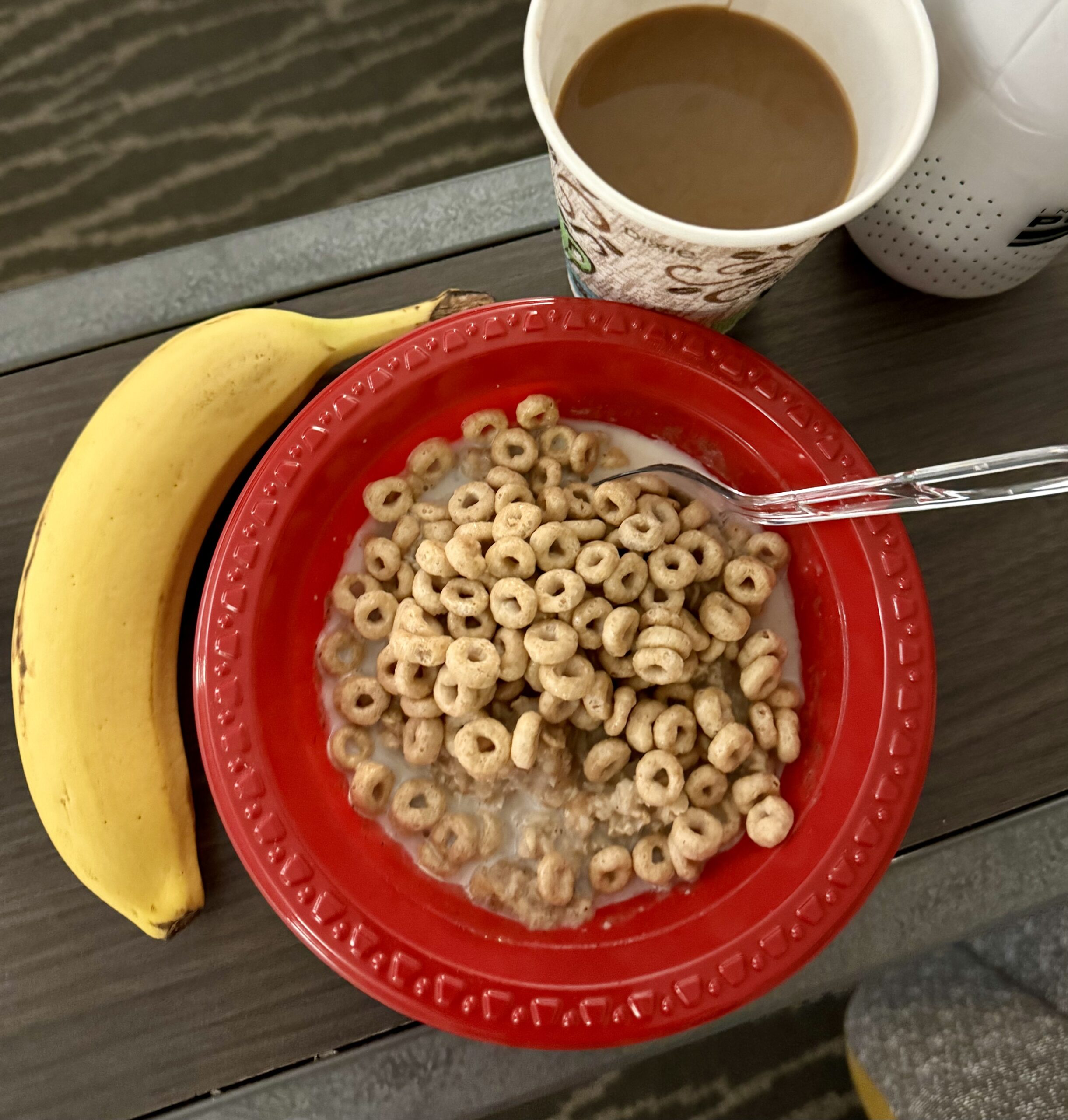 Sunday morning came early, but fortunately Mark and I were still a bit jet-lagged, so we were asleep by 7:45pm the night before and actually got a pretty decent night’s sleep by 4am. My stomach was blessedly (mostly) calm, and I felt excited and ready to go. I ate my race-day breakfast of 2 packs of instant oatmeal with a few Honey Nut Cheerios sprinkled on top, a banana, coffee, and 500ml of Liquid IV for hydration. Then I got dressed and ready to head out to the transition area to set up my own personal area under my bike with everything I would need to change from swim to bike (T1) and bike to run (T2.)
